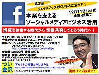ノブ横地氏の金沢でのフェイスブックセミナは続編の2回めを12月11日にITビジネスプラザ武蔵で開催する。このセミナは前回(11月6日)に行ったセミナが好評でぜひ続きを聴きたいという受講生の声で実現した。2回め以降は「つい金沢」が主催ではなく、事務局側の遠田も飯山代表も都合で参加できない。つい金沢は後援とし、遠田は後方支援で広報の応援をする。初回の受講者たちは受付や会場設営などで盛り上げてほしい。