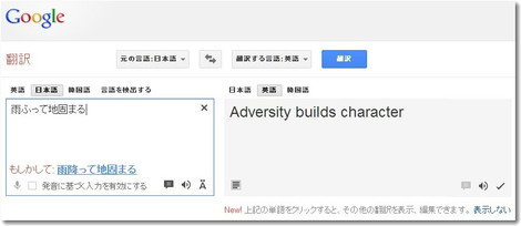上記の画像は、google翻訳で日本語で「雨降って地固まる」と発生したさいの処理結果画面だ。左下に「マイクのアイコン」があり、このマイクのアイコンをクリックすると音声入力を認識してくれる。入力言語は日本語だけでなく英語でもOKである。