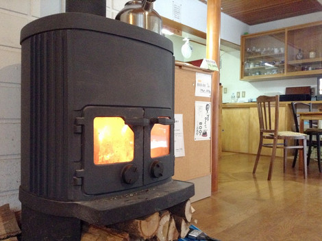 ▼蕎麦屋の中には薪ストーブがあり、室内はぽかぽかと暖かい。