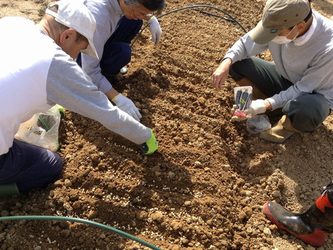 大豆の苗床では、大豆をまいて土をかぶせてからたっぷりと水をあげる。これで順調に発芽してくれるはず。順調に育てば2週間後の6/2(日)に定植作業で畑に大豆を植える。