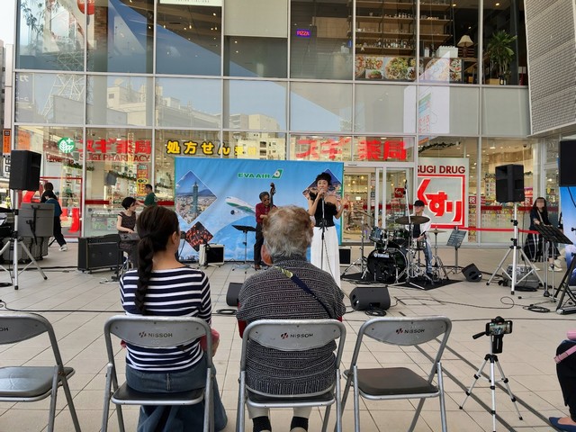 片町きらら前の特設ステージでは商業施設内という特徴があります。通常の買い物客や観光客が横をとおるような距離の近さがあります。また、この日は雲一つない晴天で紫外線の強い直射日光がギラギラとしていたこともあり、日陰になる観客席にゆっくりと座れるのもよいところですね。