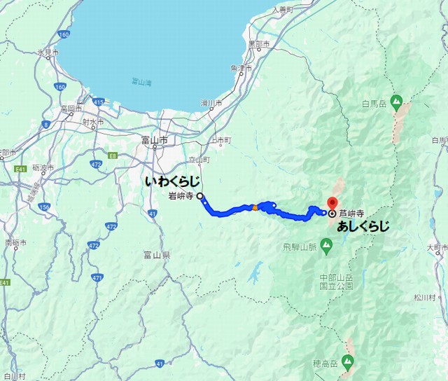 岩峅寺は富山平野の一部ですが、芦峅寺は完全に山中です。グーグルマップでは自家用車で1時間半(45.7キロ)かかります。