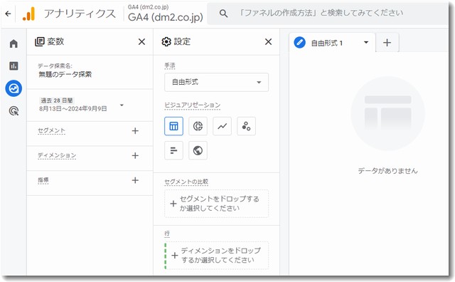 すると「データ探索」という画面になります。この画面で自分が注目したいアクセス解析だけを抽出することができます。