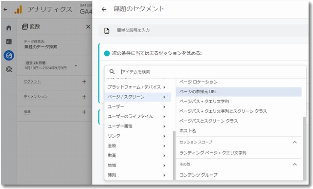 「セグメント」を選択し、右側に表示されるところには「ページ/スクリーン」を選択します。さらにその右に表示されるメニューから「ページの参照元URL」を選択します。