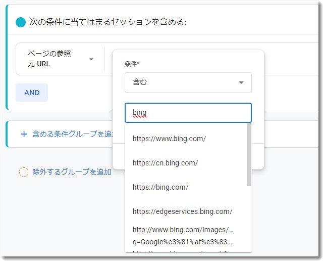 次に条件を入力します。ここでは「bing」を含むという設定にしました。