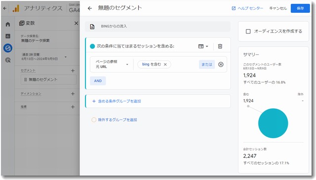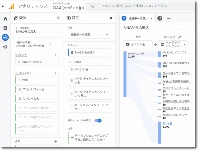 そこで、特定のことだけをわかるようにするカスタマイズされたレポートを見ることができるようにしました。ここでの事例は「BING」という検索エンジンから当サイトに流入してきた分だけをアクセス解析するというオリジナルレポートを作成しました。GA4の「探索」というメニューを使うとわりと簡単に設定ができます。みなさんは「BING」の部分を特定のサイト名に置き換えればそのまま応用できますので参考にしてください。