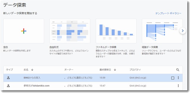 このデータ探索の名称は「BINGからの流入」という名前に変更しました。名前の変更は上記の画面の三点リーダー(︙)をクリックすると編集できます。