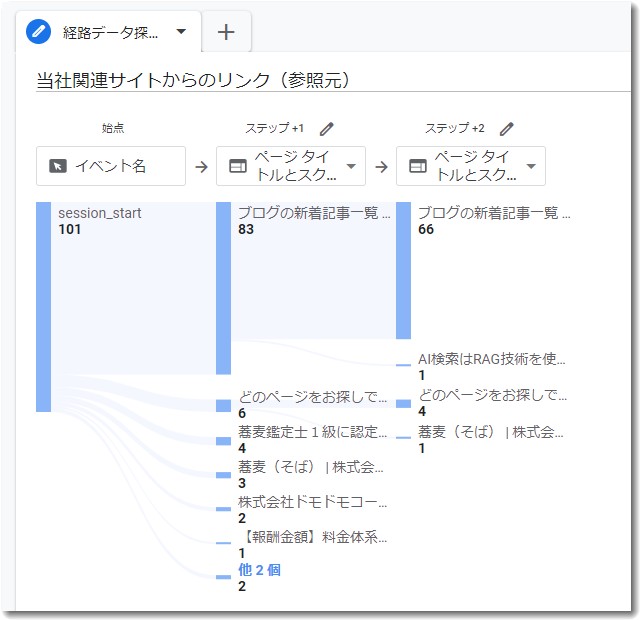 これで、4つのドメインからの流入がどのページに着地しているかというトラフィックの流れがわかります。