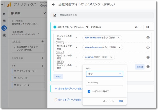 この設定に「当社関連サイトからのリンク(参照元)」というデータ探索名をつけておくと、クリックするだけで状況がわかります。