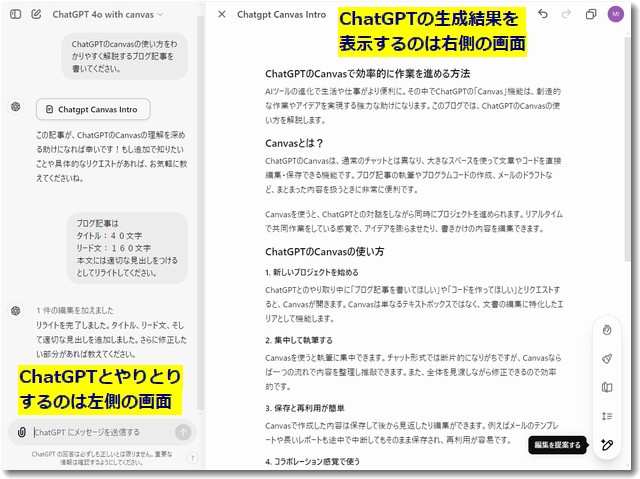 Canvasを使うと執筆に集中できます。チャット形式では断片的になりがちですが、Canvasならば一つの流れで内容を整理し推敲できます。また、全体を見渡しながら修正できるので効率的です。