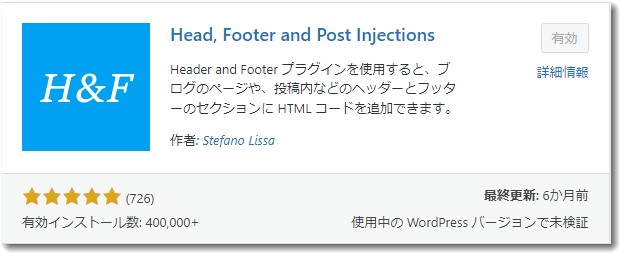 - 検索ボックスに「Head, Footer and Post Injections」と入力し、表示されたプラグインをインストールします。