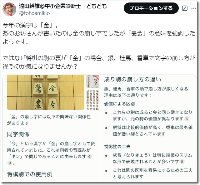 今年の漢字が「金」でした。「裏金」という意味があったらしいのですが、あのお坊さんが書いた字が将棋の駒の崩し字に似ていましたね。ここまで話が及ぶとは、どもどもカフェならでは(笑)将棋の奥深さと日本文化のつながりを感じさせる瞬間でした。