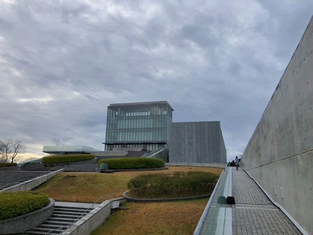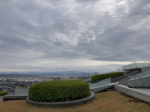 西田幾多郎記念哲学館は小高い丘の上にあります。天気の良い日は立山連峰がはっきりと見えることがあります。この日はくもり空でしたがかすかに立山連峰が真っ白に雪化粧している様子を見ることができました。