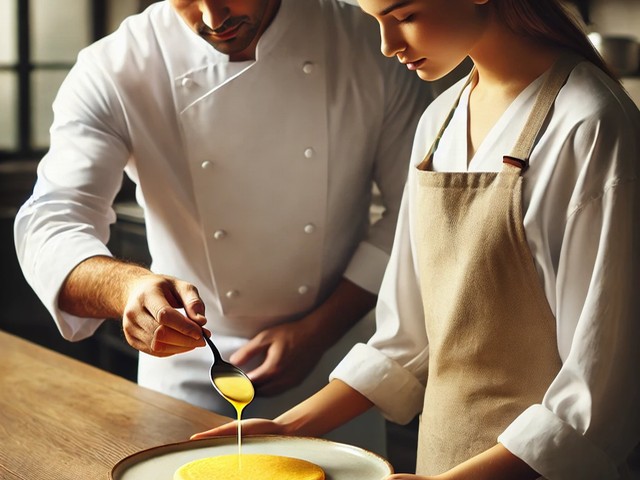 料理の達人が弟子と肩を並べて調理し、火加減を体で教える。