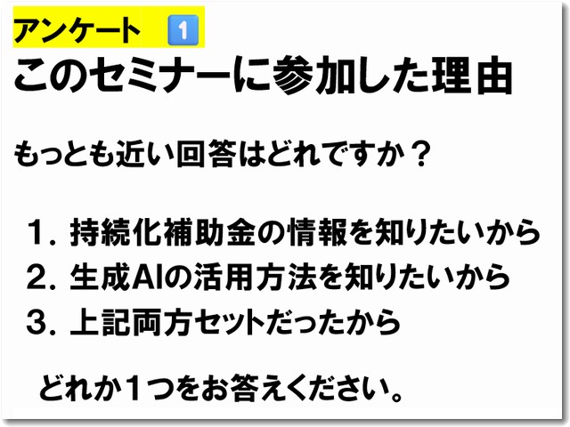 すると最も多かった回答は、「2.生成AIの活用方法を知りたいから」が圧倒的に多かったのです。次が「3.上記両方がセットだったから」でした。そして、「1.持続化補助金の情報を知りたいから」という方はいませんでした。