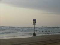 千里浜(ちりはま)は砂粒が小さいため、クルマで波打ち際を走ることが可能。そのため砂浜のあちこちに標識がある。「川あり」の標識も当初は砂浜にあった。砂浜にあった標識が海に浸かっているのは「海岸浸食」が原因だ。ここ数年「海岸浸食」により急激に砂が減少している。