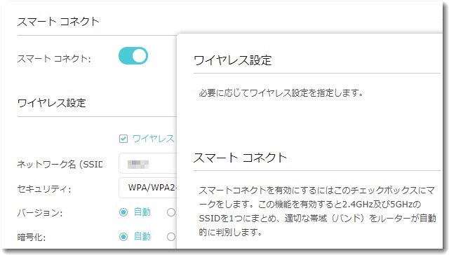 Wi-Fiには5Ghzと2.4Ghz帯という2つの電波がありますが、スマートコネクトという設定にすると自動的に最適な回線を選んでくれるようです。地味に便利な機能ですね。