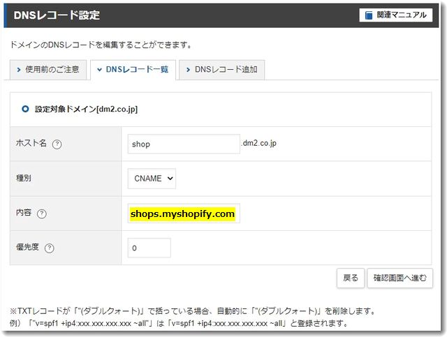 エックスサーバーの場合は「shops.myshopify.com」の後ろの「.」は不要です。「.」は自動的に付与されるようになっています。このほうがわかりやすいですね。