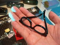 ちっちゃいメガネ。マスコットメガネというらしい。マスコットメガネは人が使うことはできない小さなサイズ。マスコットメガネは本来メガネ店の店頭飾りつけ用だ。このマスコットメガネがヤフーオークションで結構な値段(5000円程度)で取引されている。人様が使うメガネ(ネコメガネなら1995円)より高いかも…。マスコットメガネの使用目的はお気に入りの人形にかけさせることのようだ。(マスコットメガネ)